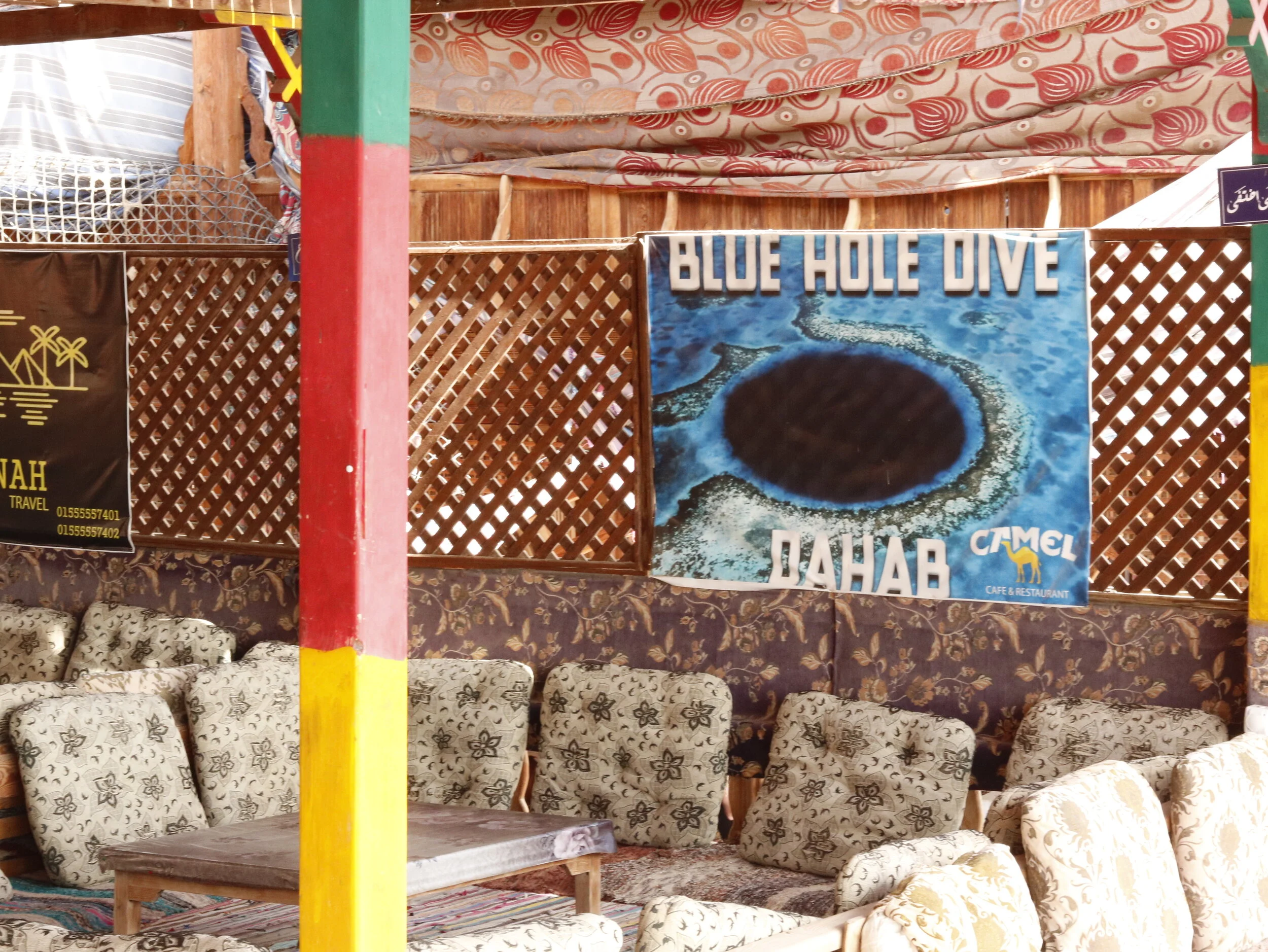 We drop our gear near the water and head to the Camel Restaurant, an open coffee shop with floor seating and amazing views of the sea. Cats speckle the floor, lounging in the sun, curious of our arrival but not in a hurry to say hello. Advertisements hang next to makeshift walls of curtains. One Camel Cigarettes banner proudly shouts BLUE HOLE DIVE - DAHAB, with a picture of the wrong Blue Hole in Belize. I point this out to our guides and we have a good laugh.